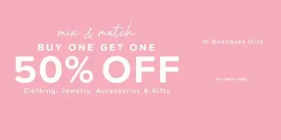 Save big now! Shop in store and get clothing, jewelry, accessories & gifts for buy one, get one 50% off.