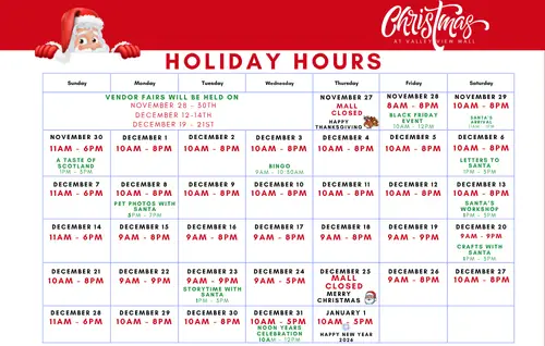 The hours highlighted in red show our mall operating hours, and the sections marked in green feature some of our big holiday events you won’t want to miss!